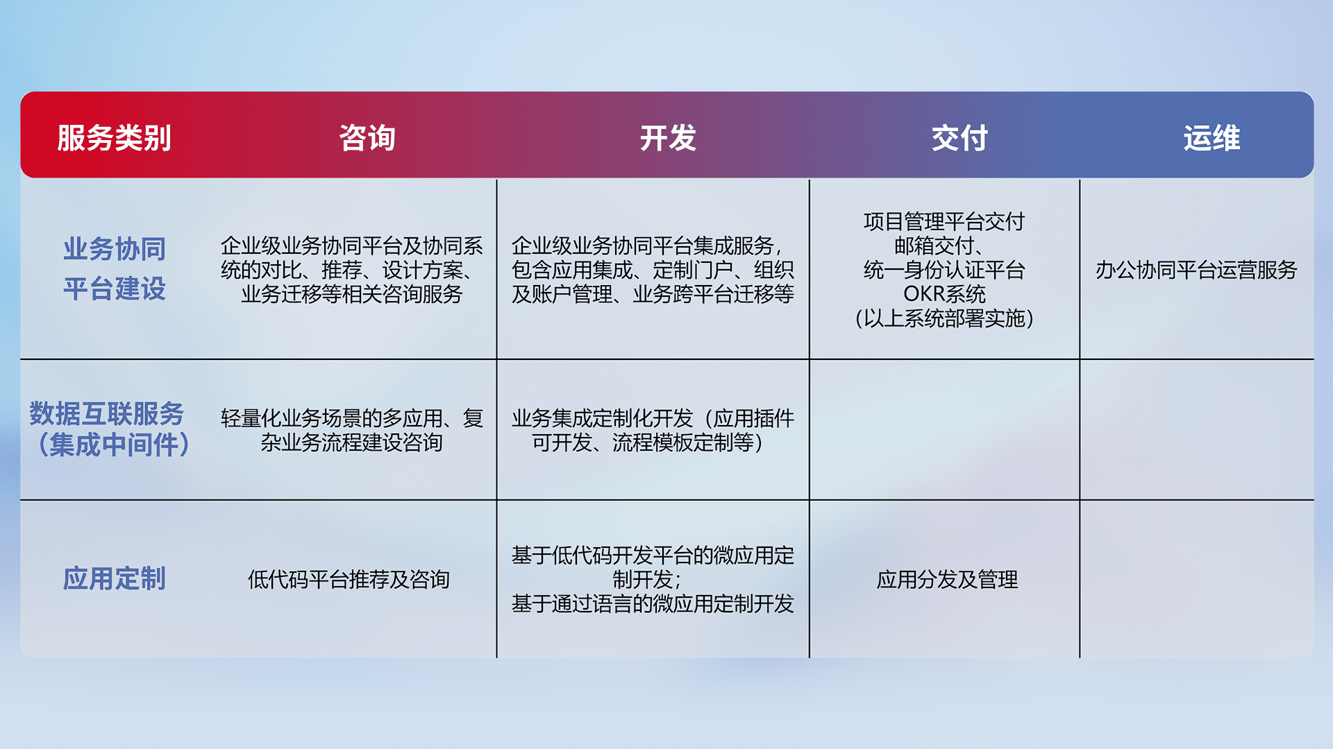 针对钉钉、、、、企微、、、、IDaas等平台级产品提供产品的规划、、方案、、、交付、、、、定制化开发等服务,,,实现如统一协同办公、、智能客户服务、、、混合会议管理、、、、智能数据查询、、、、等业务场景,,实现数字化转型。。。。
