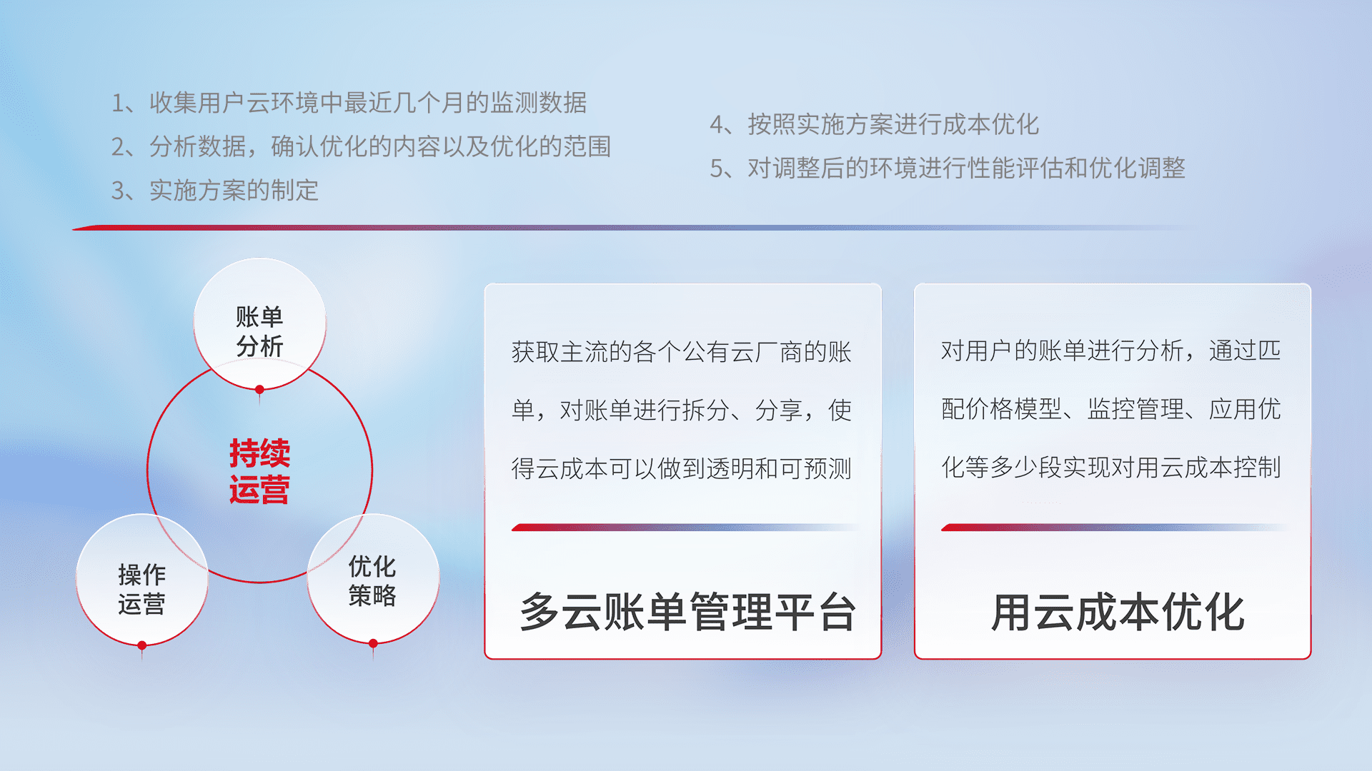 通过多云纳管,,,以统一的资源数据模型把客户的云资源进行抽象和封装,,,进而实现对多云资源的统一操作,,,保障云资源管理的可靠性、、、、稳定性与可用性。。。量身定制化运维内容,,,,配置、、、、开发运维、、补丁管理、、、、备份、、、、监控、、、、认证和访问管理、、审计和日常巡检等,,,,保障在用云过程中的可靠度,,,,稳定度以及高可用率。。。。